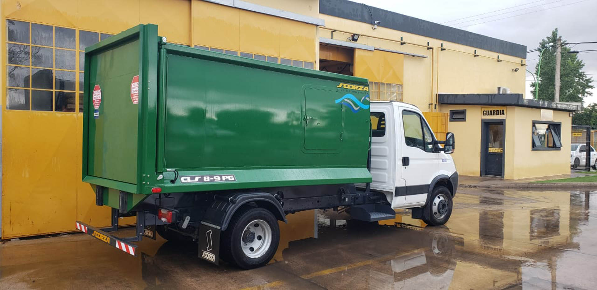 Todos los modelos descargan los residuos por vuelco trasero mediante angulación trasera, excepto el modelo CLS 8-9 PG que posee puerta tipo guillotina, la cual permite realizar la transferencia de residuos a equipos recolectores de carga trasera mediante placa expulsora.