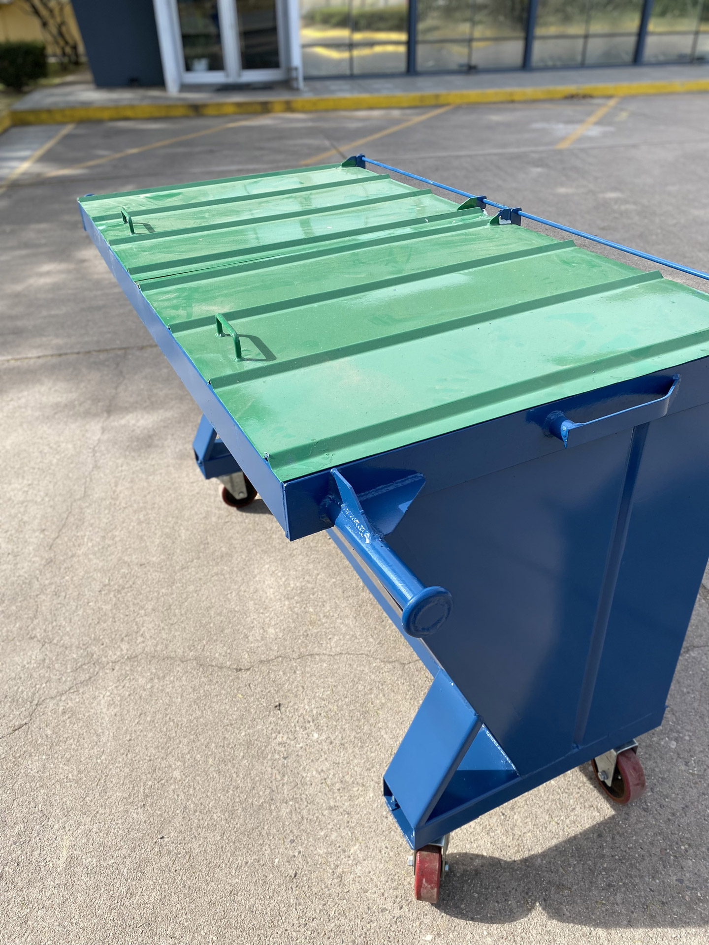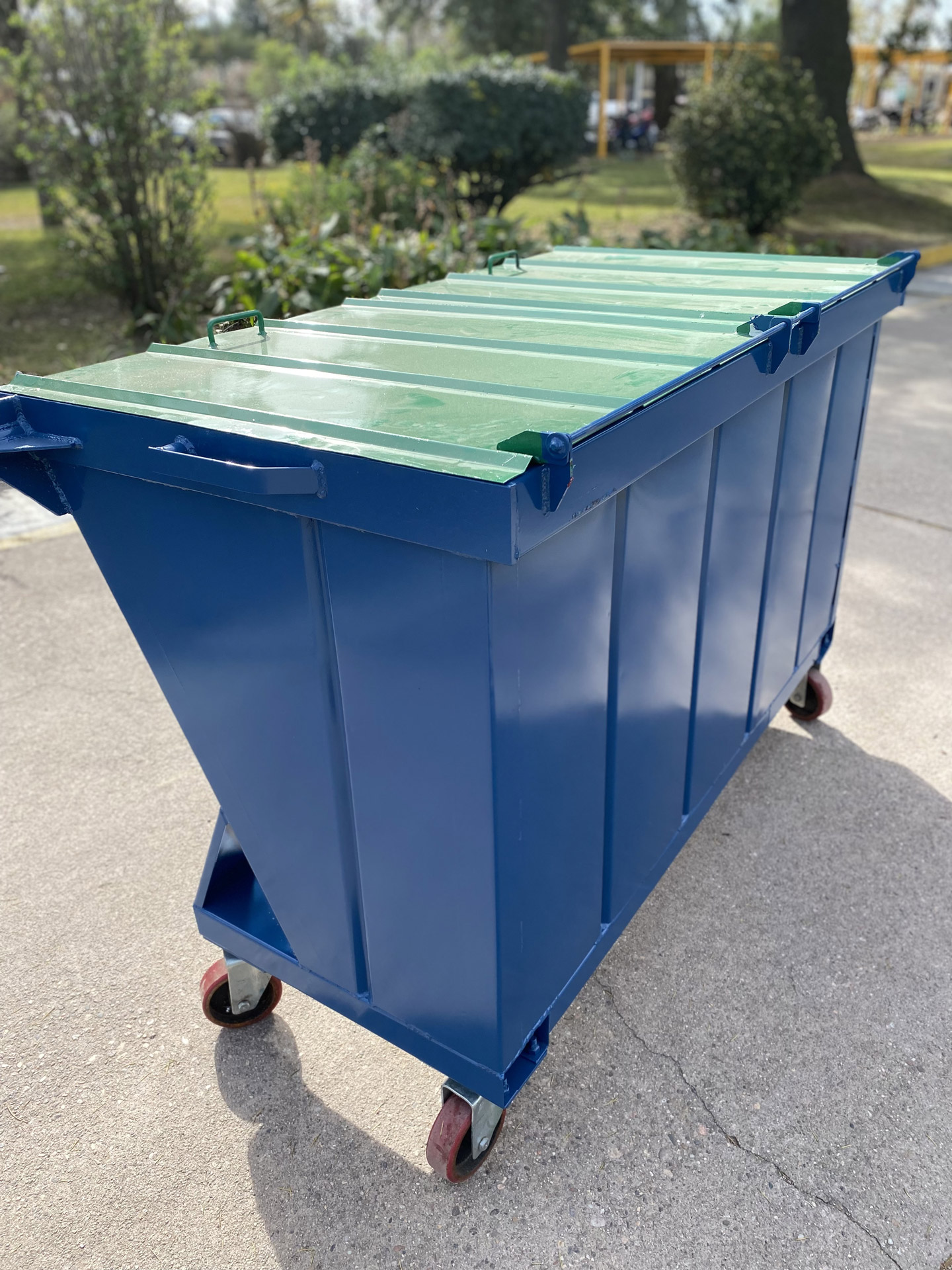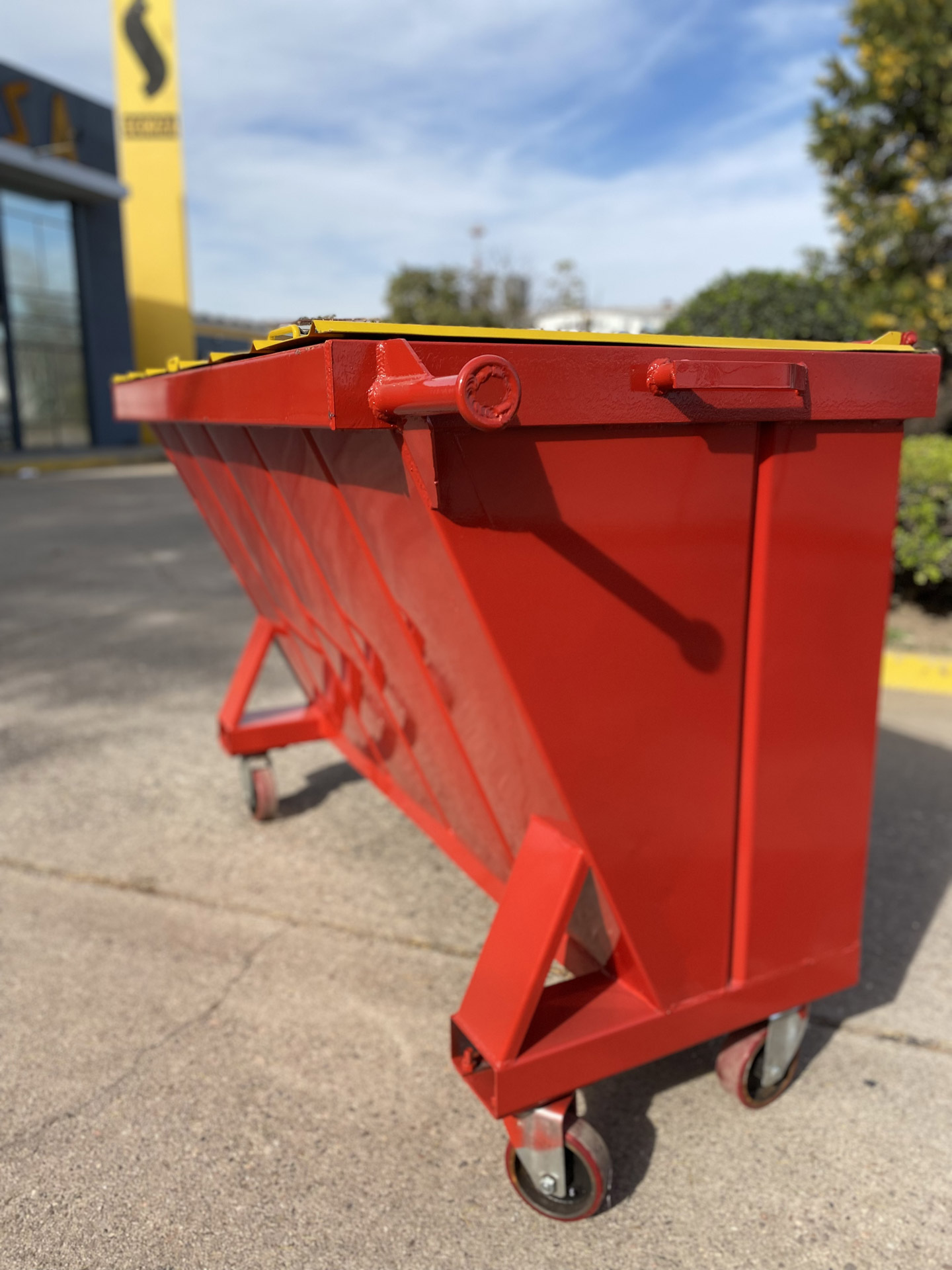 Borde superior reforzado en hierro planchuela de 3,1/2” x 1/2”, sobre el que van soldados los pernos de giro en hierro redondo SAE 1045 y las manijas de tiro. Montado sobre 4 (cuatro) ruedas giratorias con banda de rodamiento de poliuretano de alta resistencia (adiprene).