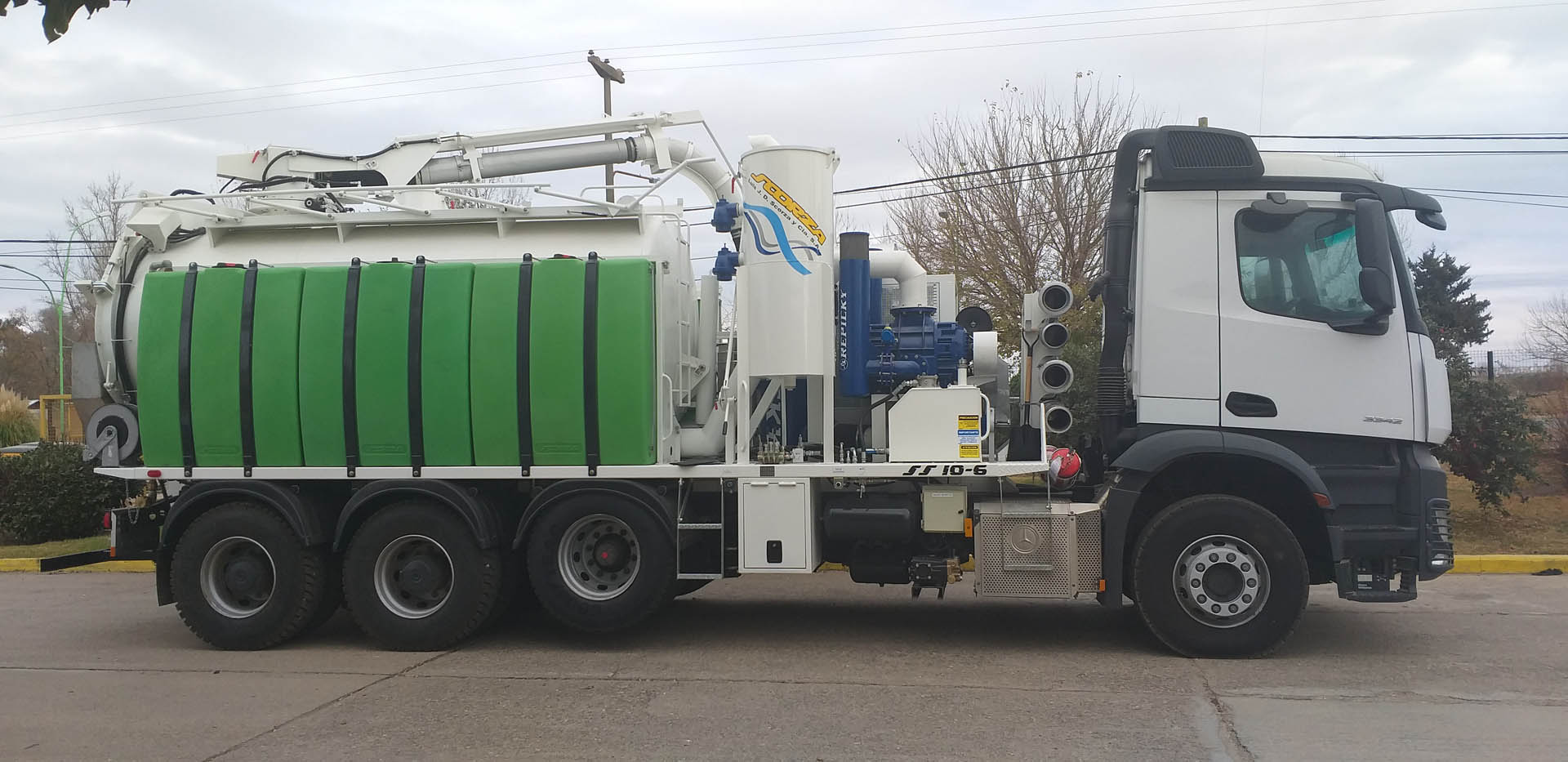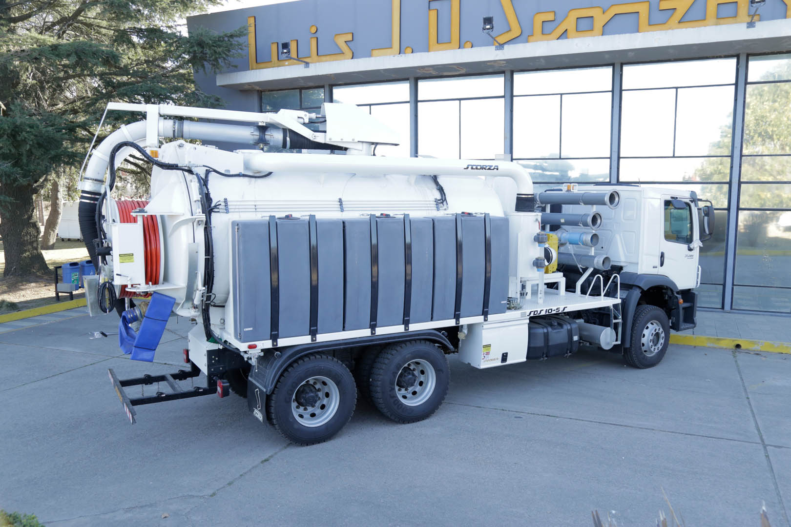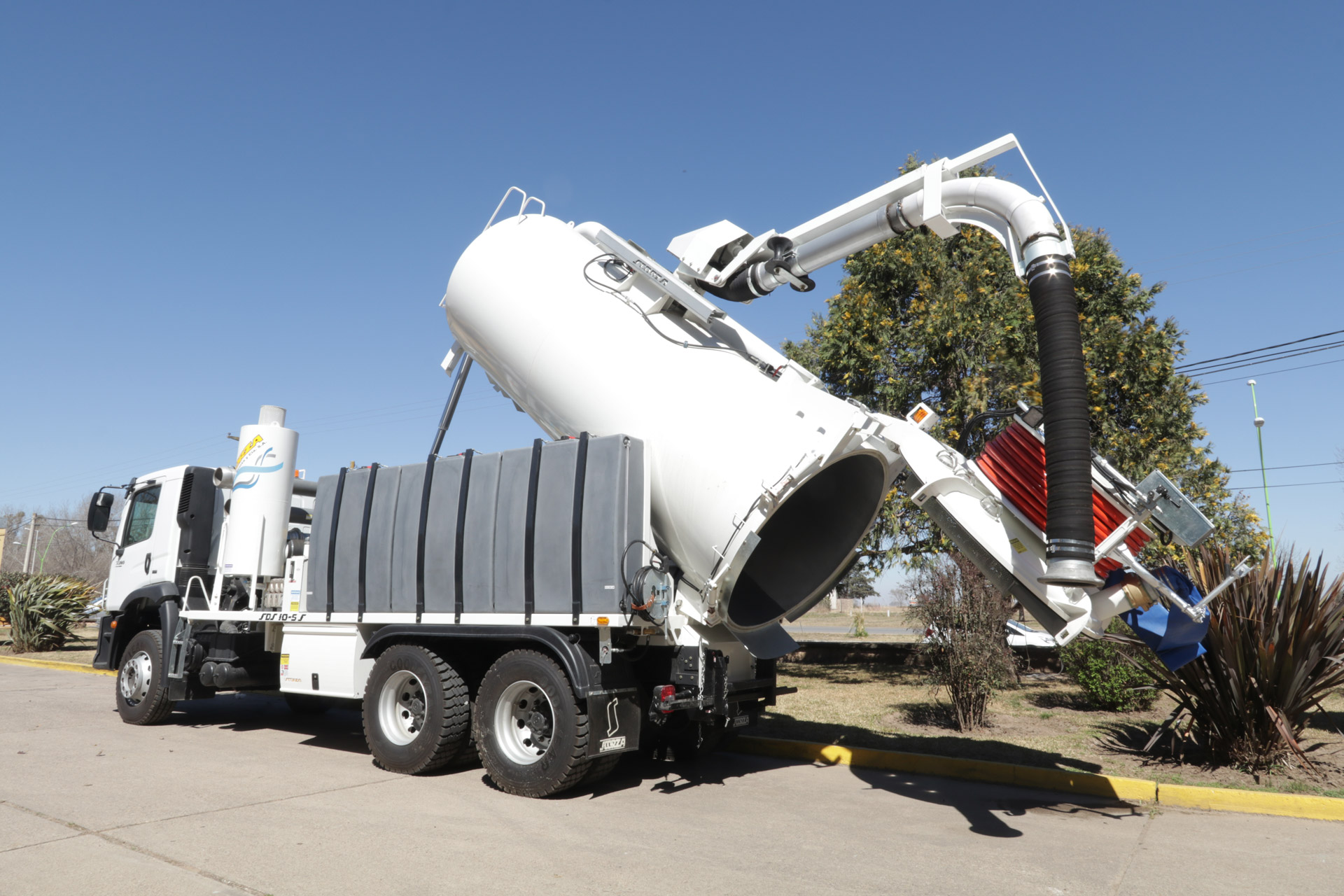 Carrete de Manga Desobstructora: De ubicación trasera, montado en compuerta de depósito de carga, rebatible y orientable en abanico de 180°, construido en chapa de acero, capacidad 250 mt de manguera.