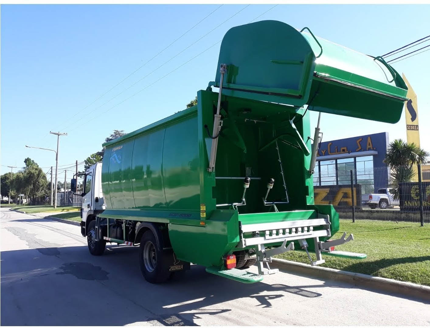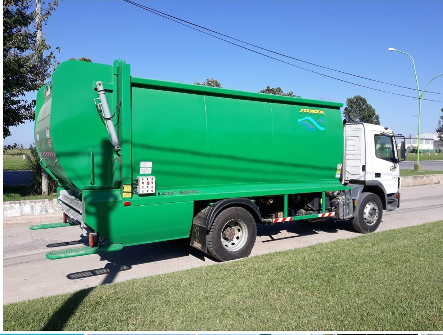 Apto para lavado de contenedores mediante proyecciones de chorro de agua por alta presión desde barral con picos y cabezales de lavado ubicados en tolva trasera.
