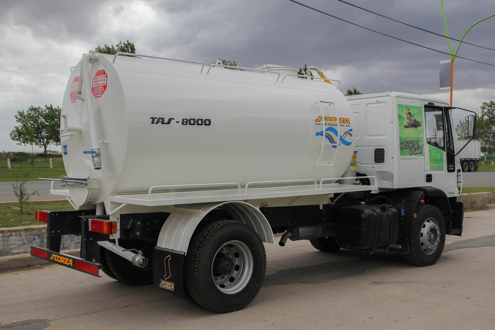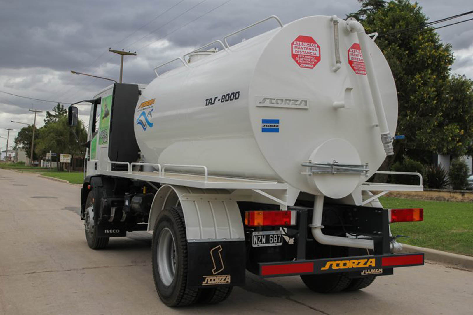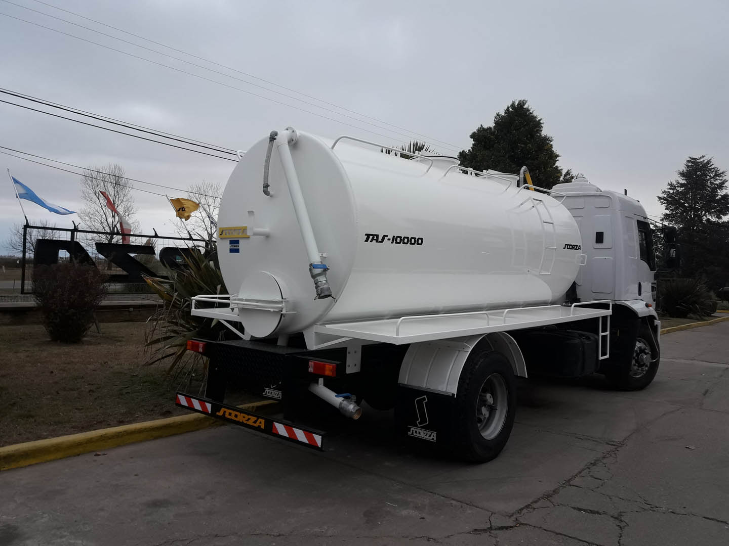 De forma cilíndrico con cabezales cónicos, construido con chapa de acero al carbono espesor 1/4”. Cuenta con rompeolas, boca de entrada paso hombre de 500 mm de diámetro con tapa cierre hermético, boca de limpieza y drenaje de 500 mm de diámetro en cabezal posterior, una boca de succión con válvula mariposa o esférica con boquilla acople rápido de aluminio, una boca de descarga de diámetro 3” con válvula mariposa o esférica. Pisaderas laterales construidas en chapa antideslizantes y pasamanos superiores.